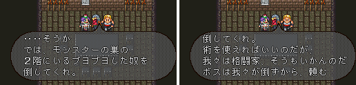・○○が攫われたから救出してほしい!→モンスターを退治して○○を助ければ解決。 ・●●を持ってこい!→●●を入手して渡せば解決。 ・□□を退治して!→□□を退治すれば解決。 ・■■の病気を治して!→アイテムを入手して■■に使用すれば解決。 |