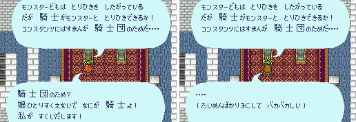 ロマ1発売当時にはこのイベントについて何とも思わなかったのであるが、後に(ネット時代になって)このイベントで「騎士団の面子を潰す」という結末があることを知って、すごくモヤモヤした気持ちになったことを覚えている。