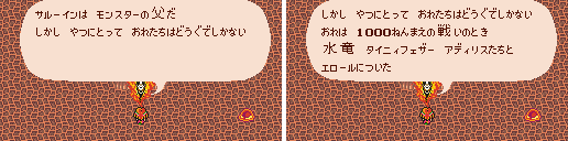 見るからに危険なサンストーンに怖いもの知らずのフレイムタイラントもさすがに一抹の不安がよぎったが、相手はモンスターの父サルーイン・・・逆らうことはできず、しぶしぶ差し出されたサンストーンを飲み込むことにした。